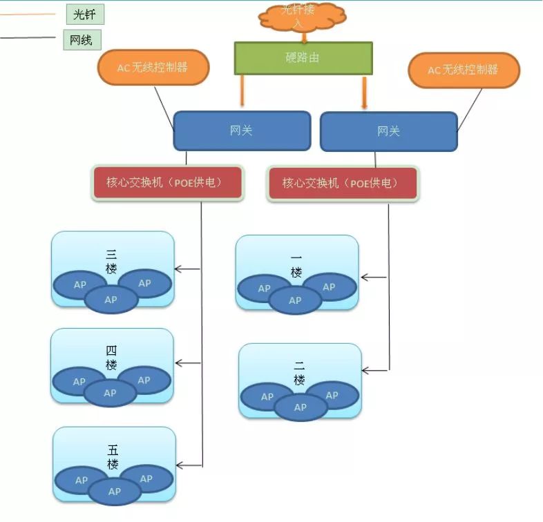 结合用户无线网络需求情况,结合产品自身技术特点,为了满足用户构建一个高速、稳定、安全、可靠、易于管理的无线接入网络的需求,本设计方案按照AP+AC的结构化无线网络解决方案进行设计。网络拓扑原理如下: