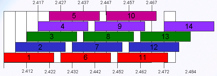 按照 802.11bgn 协议规定,WIFI 工作频段带宽为 83.5MHz,划分为 14 个子频道,每个子频道带宽为 22MHz。子频道分配如下图所示: