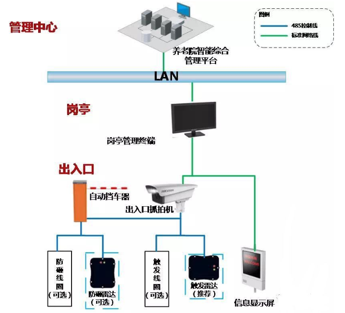 出入口管理系统由前端子系统、传输子系统、中心子系统组成,实现对进出场车辆的24小时全天候监控覆盖,记录所有通行车辆,自动抓拍、记录、传输和处理,同时系统还能完成车牌、车主信息管理等功能。